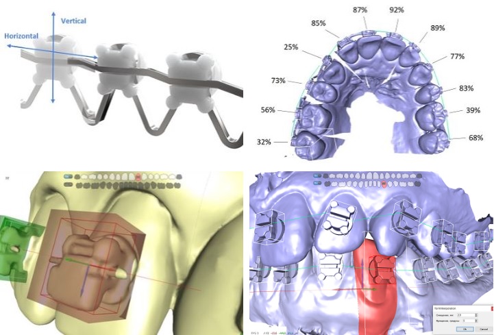 Наши брекеты оснащены горизонтальными и вертикальными пазами, позволяющими перемещать зубы в любом направлении. После установки брекетов проводится 3D-сканирование полости рта, в результате чего создается точный цифровой двойник зубочелюстной системы вместе с брекетами. Программа распознает положение пазов и учитывает эту информацию при моделировании ортодонтических дуг.