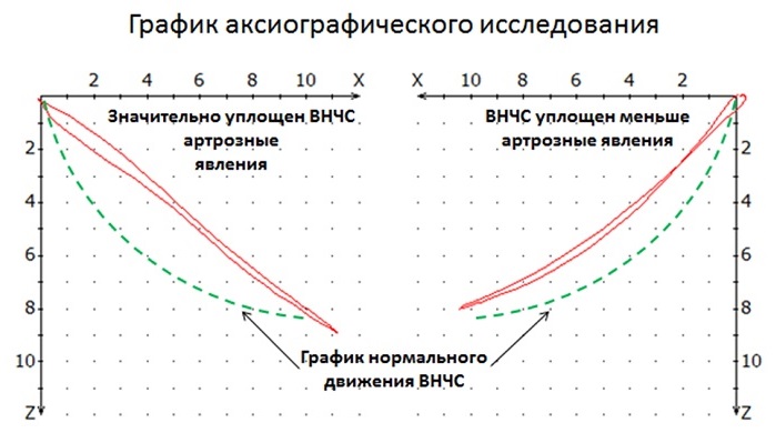 Аксиография – диагностическая процедура, позволяющая измерить с помощью специального аппарата траекторию смещения височно-нижнечелюстного сустава при различных движениях. Результатом диагностики является определение отклонений и  репозиция нижней челюсти — определение ее целевого анатомического положения. (Подробнее об аксиографии).